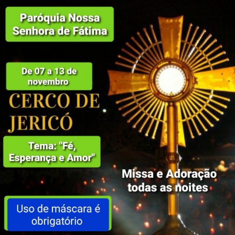 A Paróquia Nossa Senhora de Fátima em Monte Alegre do Piauí, vai realizar o 3° Cerco de Jericó do dia 07 a 13 de novembro no Santuário Nossa Senhora de Fátima com o tema: Fé, Esperança e Amor.