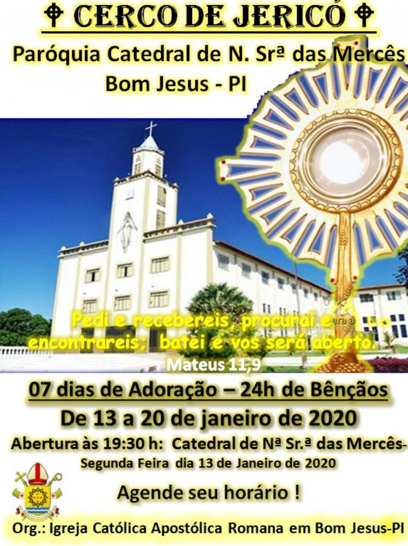 Amados e amadas, paz e bem ! Inicia-se nessa segunda feira dia 13 de janeiro de 2020 e vai até na outra segunda-feira dia 20, o Cerco de Jericó na Catedral de N.Sra.das Mercês em Bom Jesus-PI. Serão 24hs de adoração ao Santissimo Sacramento, durante os 07 dias para começar bem nosso ano de 2020. Neste cerco a proposta do Padre José Dino e Padre Juscilei e que possamos ter Missas todas as noites na Catedral a partir das 19:30h.