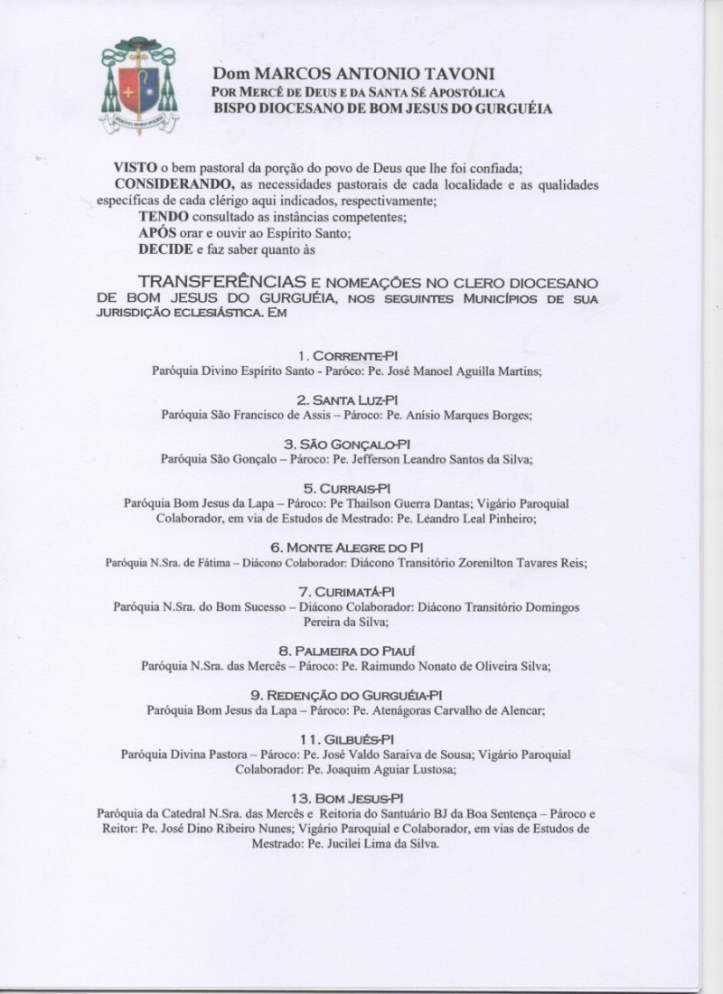 Após anunciar as transferências de Párocos na Diocese de Bom Jesus do Gurguéia no encerramento dos Festejos de Nossa Senhora das Mercês, Dom Marcos Tavoni apresenta seu "Comunicado Oficial" a todo o povo de Deus.
