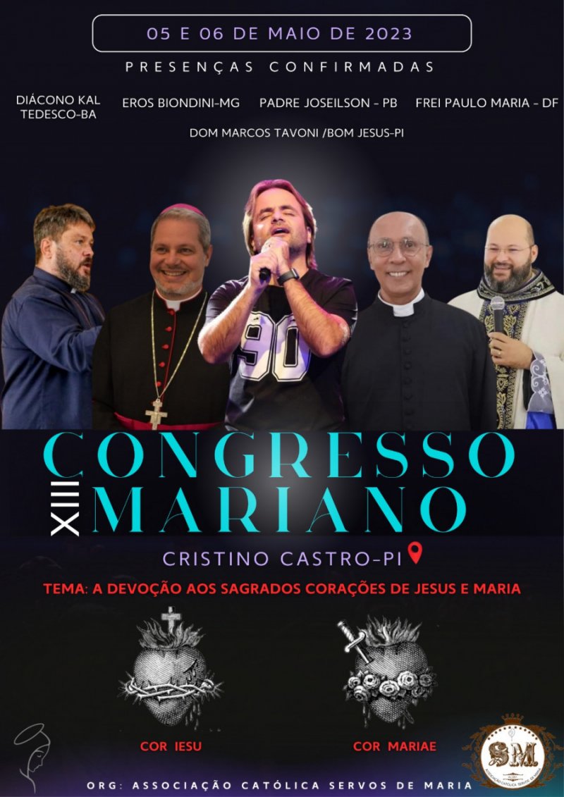 O XIII Congresso Mariano, promovido pela Associação Católica Servos de Maria, de reconhecimento Diocesano, e que aconteceu em Cristino Castro-PI nos dias 05 e 06, teve Missa Solene em seu encerramento, no sábado às 19h. A Celebração foi presidida por Dom Marcos Antonio Tavoni, nosso Bispo Diocesano; teve a concelebração dos Padres Pe. Léo Gasqui, da Diocese de São Carlos-SP, em visita missionária à Diocese, Pe. William Bonfim, Pároco em Cristino Castro, e participação do Diácono Renato das Chagas. O Evento Religioso, que reuniu uma multidão de participantes de todas as partes da Diocese, contou com a presença de vários grandes pregadores À nível nacional. Ao final da Santa Missa e do Encontro os fiéis foram agraciados com o Show do Cantor Católico, mineiro, Eros Biondini.