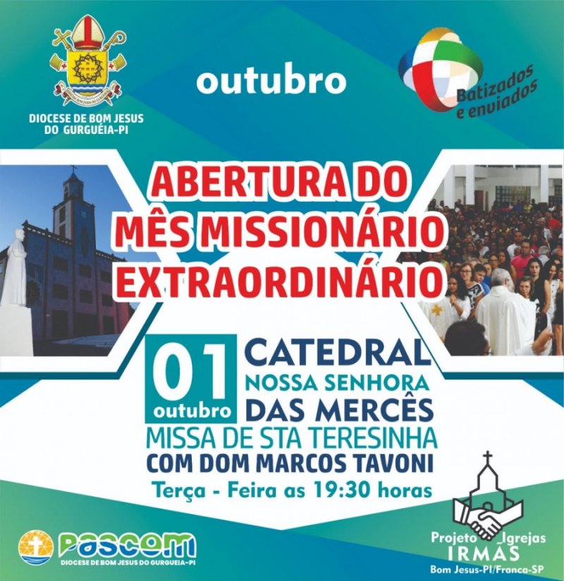 No mês de outubro a Igreja vai vivenciar em todo o mundo o Mês Missionário Extraordinário (MME), proclamado pelo Papa Francisco para 2019 e que traz como tema: Batizados e enviados: a Igreja de Cristo em missão no mundo. Na Diocese de Bom Jesus do Gurgueia, o lançamento oficial será no dia 1 de outubro com uma celebração Eucarística na Catedral de Nossa Senhora das Mercês em Bom Jesus-PI que será presidida por Dom Marcos Tavoni.