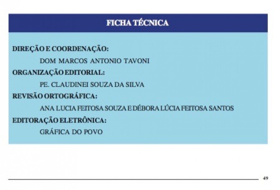 Em Assembléia Diocesana, no dia 25 de novembro o Clero e Agentes de Pastoral estiveram reunidos junto a Dom Marcos Antonio Tavoni, Bispo Diocesano para conhecerem o primeiro Diretório dos Sacramentos da Ininiação à Vida Cristã. O Diretório foi fruto de uma reflexão iniciada nas bases das paróquias e comunidades, passando pelas mãos do clero e por fim sendo apresentado em Assembléia aos agentes do Batismo, Crisma e Eucaristia. Padre Claudinei foi o Assessor que apresentou o resultado de todo o processo para a elaboração do Diretório e o apresentou o mesmo. Na ocasião Dom Marcos tirou todas as dúvidas que surgiram e orientou os agentes e padres para a implantação do Diretório. A Assembléia também teve carácter Celebrativo onde os Sacramentos da Iniciação Cristã foram os destaques.