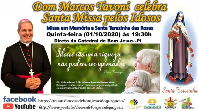 No próximo dia 01 de outubro de 2020 (quinta-feira) às 19:30 h na Catedral de N. Sra. das Mercês- Bom Jesus - PI, Dom Marcos Antõnio Tavoni Bispo da Diocese de Bom Jesus do Gurgueia- Pi, por ocasião do Dia Internacional da Pessoa Idosoa, estará celebrando uma missa especial , com oração e bênção pelas pessoas idosas.