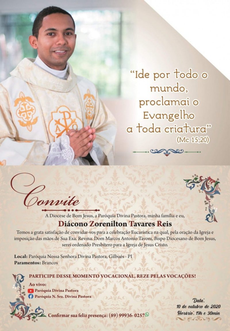 Zorenilton Tavares Reis, nasceu no dia 25 de fevereiro de 1992, em Gislbués-PI e pertence à Paróquia Divina Pastora, Capela Santa Tereza e Divino Espírito Santo, Comunidade Marmelada. Filho de Zoroastro Vieira dos Reis e Francileide Tavares da Silva Reis. É o primeiro de 4 irmãos; Railton, Raiane e Railson. Com o incentivo e apoio vocacional do Pe. Izaías Pereira da Silva, no dia 03 de março de 2010 ingressou no Seminário Menor em Bom Jesus. No ano seguinte foi enviado para o Seminário Menor da Diocese de São Raimundo Nonato e em 2012 passou a residir no Seminário menor da Diocese de Oeiras. Em 2013 ingressou no Seminário Maior, em Teresina, onde Licenciou-se em Filosofia e Teologia. No período de formação participou de pastorais nas paroquias das Dioceses de Bom Jesus, Teresina e Campo maior e vivenciou profundas experiencias missionarias no Amazonas, Rondônia e Maranhão. Recebeu ordenação Diaconal no dia 13 de julho de 2019, na Paróquia São Pedro Apóstolo, em Bom Jesus. Terminado os estudos, retornando à Diocese de Bom Jesus do Gurguéia no inicio de 2020, recebeu Nomeação para residir e colaborar com o Pe. Raylon, na Paróquia Nossa Senhora de Fátima, em Monte Alegre do Piauí. O Diác. Zorenilton, com sua simplicidade, simpatia e notório amor pela missão, tornou-se muito popular e querido em toda Diocese. Depois de “um longo e belo caminho” formativo, o Diác. Zorenilton será, agora, ordenado Padre para o serviço e missão na Igreja. (PASCOM - Bom Jesus)