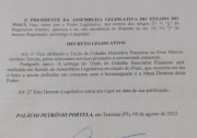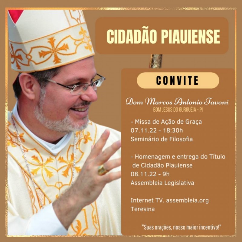 Por proposição da Deputada Teresa Brito (Partido Verde) e através do Decreto Legislativo nº 662, de 09 de agosto de 2022, a Assemblei Legislativa do estado do Piauí, atribui a Dom Marcos Antonio Tavoni, o título de Cidadão Piauiense, pelos relevantes serviços prestados à Comunidade piauiense.