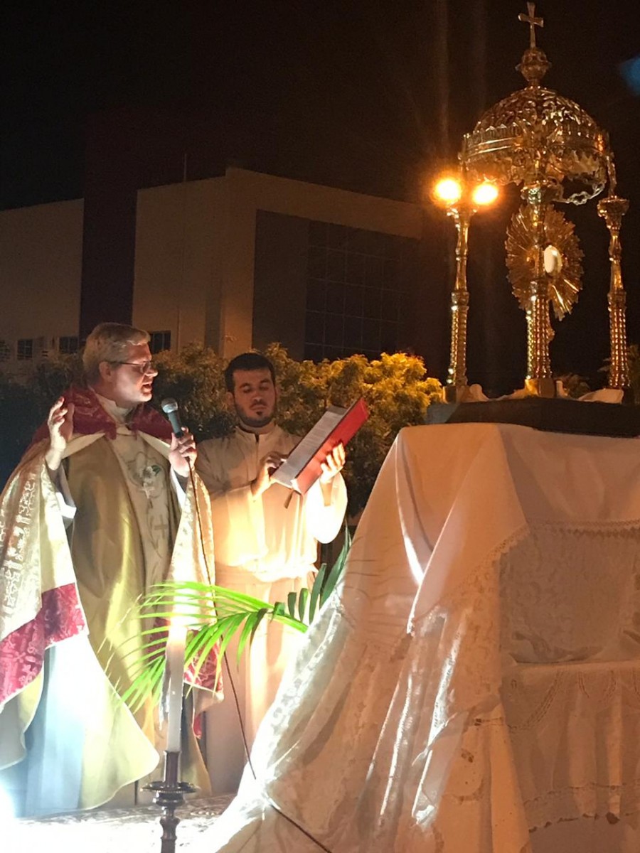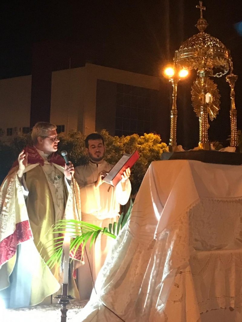 Dom Marcos Tavoni presidiu as celebrações. Na sua homilia destacou a importância da presença real de Jesus na Igreja, a necessidade da união da família em torno da mesa da refeição material, em Casa, e espiritual na Igreja. Sobre o Evangelho da multiplicação dos pães, Dom Marcos alertou: "O mundo não sabe a diferença entre divisão e partilha. Jesus partilhou o pão, deu graças, abençoou. Os que estão à frente do mundo não resolvem o problema da fome por puro egoísmo, centralidade. Arrecadam para si e dividem, egoisticamente, não sabem partilhar. Pão partilhado é pão agradecido, abençoado, não é pão extorquido, extraviado, corrompido e por isso nunca dá e nem sobra para ninguém. O proplemas da fome não é a falta de alimento e sim de Amor. Temos que viver do pão que Jesus ensinou a partilhar. Ele é o pão que desceu do céu.".