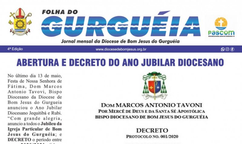 Neste primeiro de junho de 2020, memória da Bem-aventurada Virgem Maria, Mãe da Igreja e dia Nacional da Imprensa, a Diocese de Bom Jesus do Gurgueia-PI, através da Pastoral da Comunicação (PASCOM), apoio do Bispo Dom Marcos e assessor Padre Leandro, colocam à disposição de toda a comunidade cristã da diocese, a quarta edição do Jornal A FOLHA DO GURGUEIA. Possa baixar e fazer uma boa leitura do nosso JORNAL.