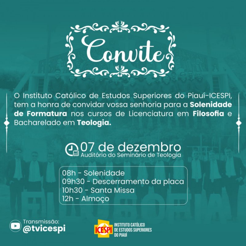 Na quinta-feira, dia 07/12, na Capital, Teresina, aconteceu a Colação de Grau, de Filosofia, dos nossos Seminaristas Danilo Tavares (Gilbués) e Renato de Freitas (Corrente), estudantes do ICESPI – Instituto Católico de Estudos Superiores do Piauí, ligado ao Seminário Provincial “Sagrado Coração de Jesus”, Casa de Filosofia, Seminário “Dom Edilberto Dinkelborg”.