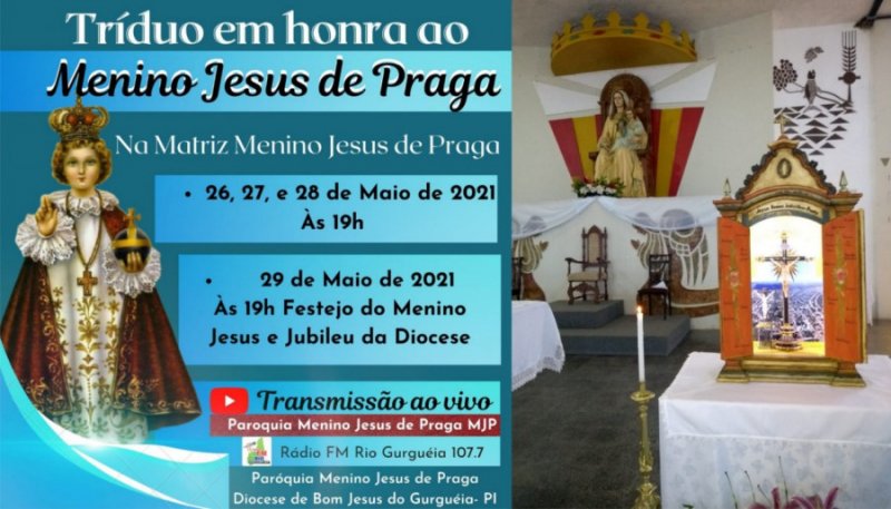 Neste sábado, 29 de maio, dentro do novenário do seu Padroeiro, a Paróquia Menino Jesus de Praga, em Bom Jesus-PI, recebe a visita do Oratório Missionário Peregrino do Bom Jesus da Boa Sentença e celebra o seu Jubileu. Na oportunidade a paróquia fará memória de sua história contextualizando os principais fatos que contribuíram para construção dos 100 anos de vida da Prelazia e Diocese de Bom Jesus do Gurguéia. A Missa Solene Jubilar será presidida por Dom Marcos Antonio Tavoni, às 19h, sendo concelebrada pelo pároco, Pe. Claudinei e demais padres visitantes; e contará, ainda, com a presenças dos aspirantes ao Diaconato Permanente, que estarão, no mesmo final de semana, recebendo formação da Escola Diaconal, instalada na Paróquia. (Pascom Bom Jesus-PI).