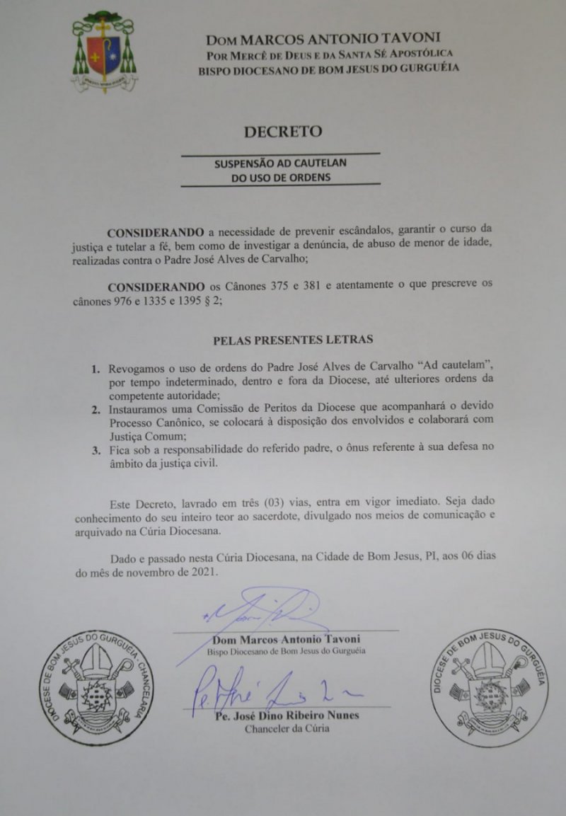 A Diocese de Bom Jesus do Gurguéia, na pessoa de seu Bispo, Dom Marcos Antonio Tavoni, comunica que recebeu, consternada a denúncia de abuso sexual de menor, supostamente, cometido por Padre da Diocese de Bom Jesus. E que a Diocese diante dos fatos divulgados em mídia, causa de escândalos dos fiéis, tem a informar: