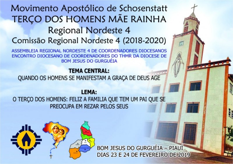 Alegremo-nos, pois se aproxima a data da realização de nossa Assembleia Regional, que este ano de 2019, foi cedida gentilmente pelo nosso Bispo Referencial Dom Marcos Tavoni, a Diocese de Bom Jesus do Gurguéia. Com a data de 23 e 24 de fevereiro, realizaremos nosso encontro, cujo Tema será “QUANDO OS HOMENS SE MANIFESTAM, A GRAÇA DE DEUS AGE” e o Lema “O TERÇO DOS HOMENS: FELIZ A FAMILIA QUE TEM UM PAI QUE SE PREOCUPAR EM REZAR PELOS SEUS”.
