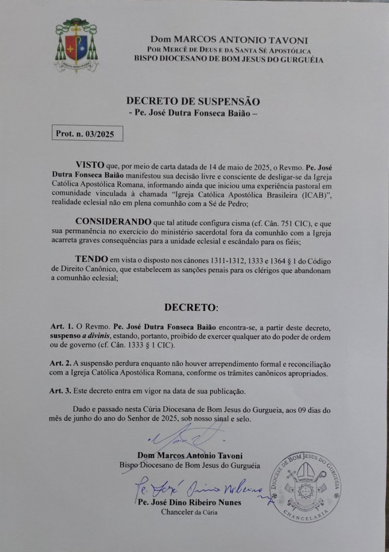 Para entender o que aconteceu com o Padre José Dutra Fonseca Baião, leia na íntegra o Comunicado de Dom Marcos e o Decreto de suspensão, publicados pela Pascom-Bom Jesus.