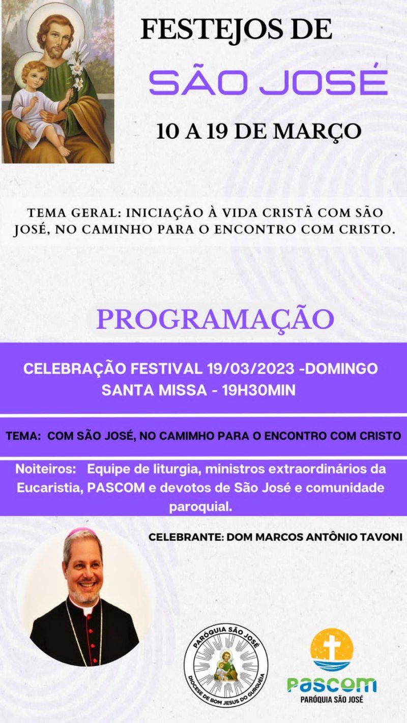 A Paróquia de São José, no Bairro Aeroporto, em Bom Jesus, celebrou o dia de São José com muita Festa e motivos de alegria. A Missa principal foi no Domingo dia 19/03, quando a Igreja Comemora a Festa de São José, Esposo da Virgem Maria. A Celebração foi presidida por Dom Marcos Tavoni, concelebrada pelo Pe. Arestides, contou com a presença do Diácono Permanente Renato das Chagas (Cristino Castro-PI) e recebeu inúmeros devotos.