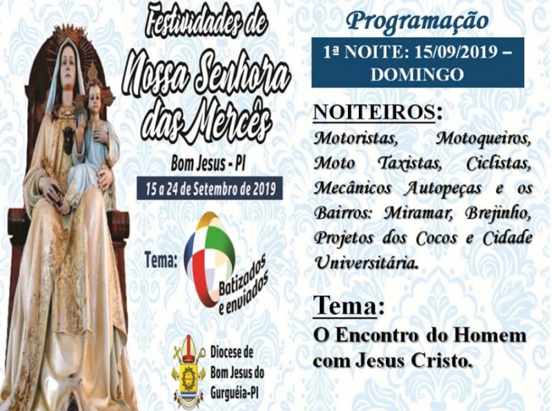 Uma tradição que marca a cidade de Bom Jesus no mês de setembro é a realização das Festividades da Co-Padroeira da Diocese, Nossa Senhora das Mercês, que em 2019 traz o TEMA: “Batizados e Enviados, a exemplo de Nossa Senhora das Mercês” e LEMA: “Igreja em Saída a Serviço do Reino”. A abertura do novenário, que sempre conta com momentos marcantes e tradicionais, será próximo domingo (15) e contará com as seguintes atividades: