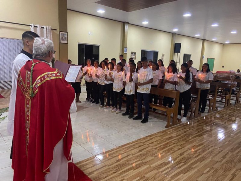 A Missa aconteceu num clima festivo; foi presidida por Dom Marcos Antonio Tavoni, concelebrada pelo P. Jefferson Leandro, Pároco do Lugar, e contou com grande número de familiares e amigos dos crismandos.