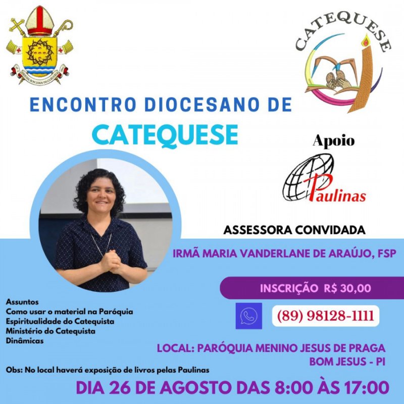 A Cidade de Bom Jesus sediou entre os dias 20 e 27 de agosto a Semana Diocesana de Catequese. O evento foi acolhido na Paróquia Menino Jesus de Praga com o tema Iniciação à Vida Cristã: Caminho para o Encontro com Cristo, e onde aconteceram várias atividades: Dia 20 aconteceu a Missa de Abertura da Semana com a presença das famílias, catequistas e crianças da Catequese; Dia 22 aconteceu uma Live com a Assessora convidada Irmã Maria Vanderlane, FSP; Dia 25 aconteceu o Santo Terço com os Catequistas da Cidade de Bom Jesus e Espiritualidade do Catequista e Coordenação, com a Irmã Vanderlane de Araújo - Paulina (Belém - PA); Dia 26 aconteceu o Encontro Diocesano de Catequese e reuniu 40 catequistas de sete paróquias da Diocese (Catedral; São Pedro Apóstolo, Menino Jesus de Praga; Cristino Castro; Santa Luz; Monte Alegre do Piauí e São Gonçalo do Gurguéia). Os temas trados no encontro foram: Espiritualidade do Catequista; Como usar o material didático, O que é IVC?; Ministério do Catequista e sugestões de dinâmicas; Por fim, no dia 27, às 10h aconteceu a Missa em comemoração ao Dia dos Catequistas.