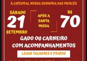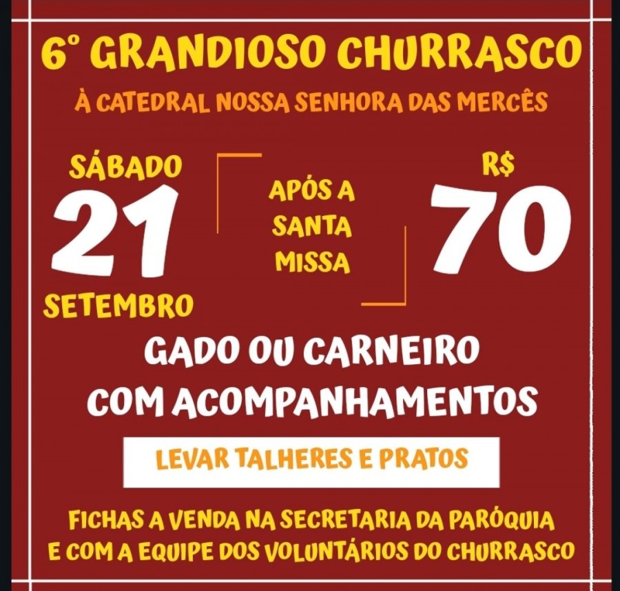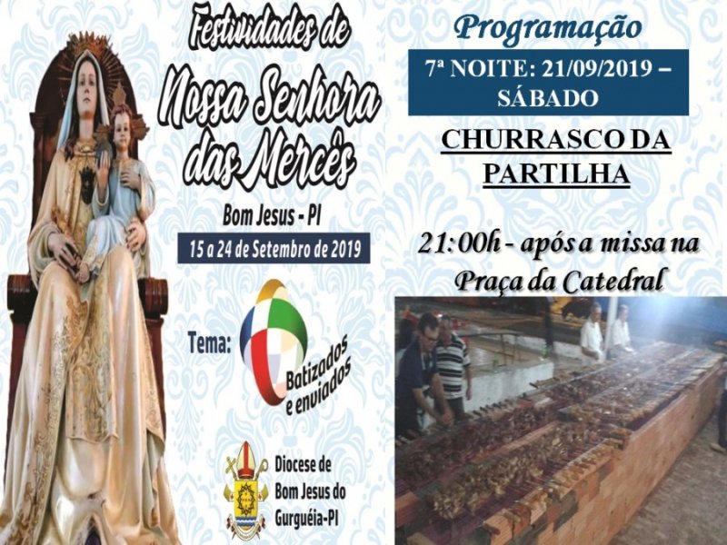 Como uma belissima tradição acontece nesse sábado, dia 21 de setembro, às 21:00 na Praça da Catedral de Nossa Senhora das Mercês, logo após a Sétima Noite de Festejos o Sexto grandioso churrasco da partilha em prol da Catedral.