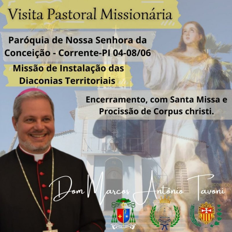 A Paróquia Nossa Senhora da Conceição ? Paróquia e Igreja Matriz da cidade de Corrente ? que tem à sua frente o Pároco Frei Francisco Oliveira, receberá de 03 a 08 de junho a Visita Pastoral Missionária de nosso Bispo Diocesano Dom Marcos Antonio Tavoni.